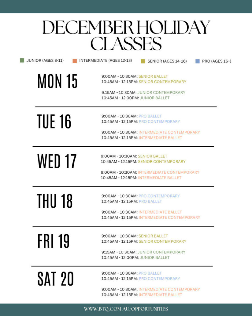 Ballet Theatre Queensland’s Holiday Classes are open to all dancers – you do not need to be a current dancer with BTQ to attend. Simply check the schedule for classes for your age group, and then book your session/s via the link below. You can attend as many classes as you like during the week. We hope to see you there!